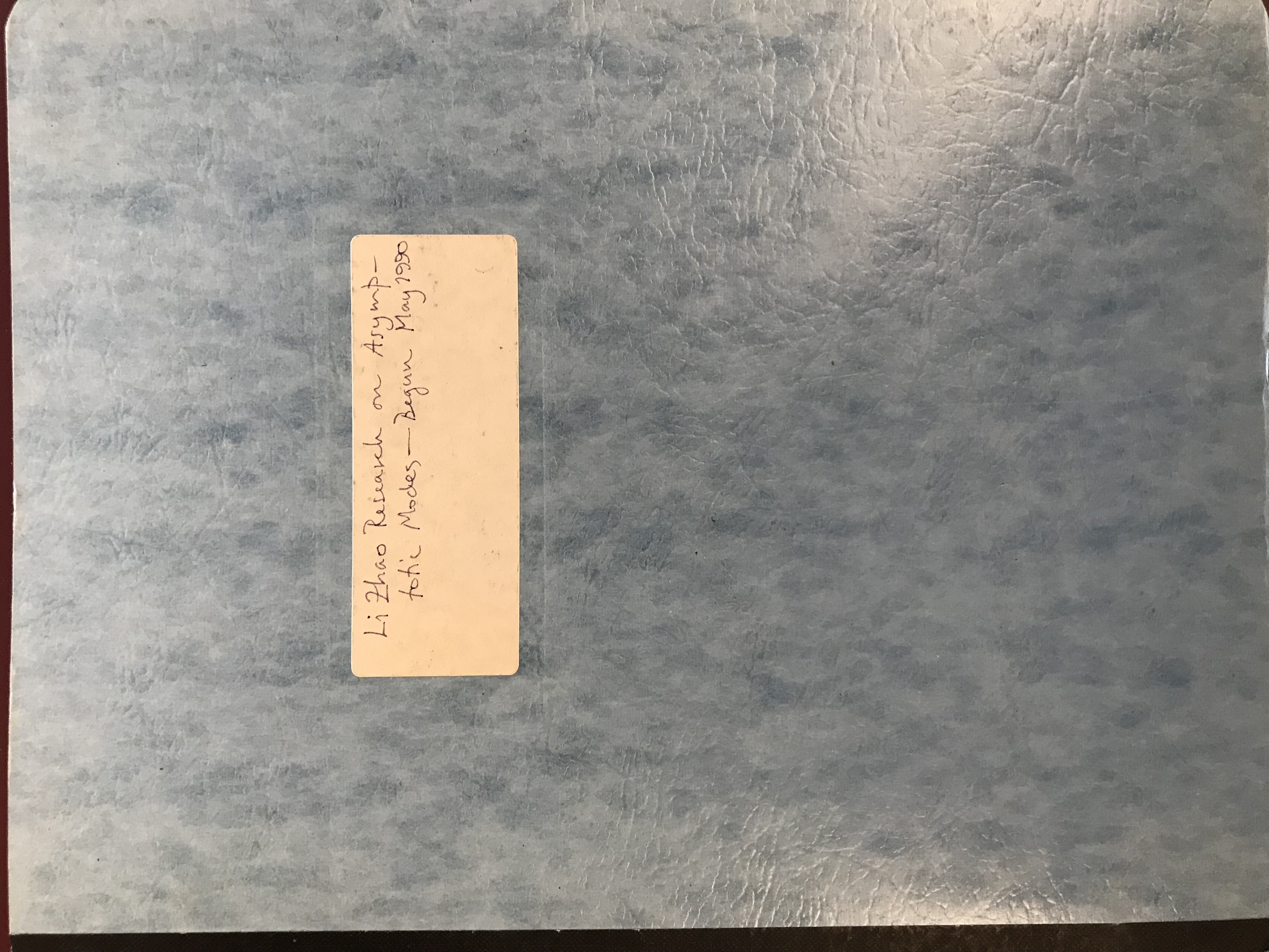 "Li Zhao Research on Asymptotic Modes" is unique because it contains only work of Li Zhao, who, between the years of 1990 and 1995, was a Ph.D. student at Princeton working with Dahlen. Li Zhao currently is a research fellow and deputy director at Sinica University in Taiwan. His website can be found here. The majority of the light blue loose leaf binder is comprised of computer generated graphs, though there are a few sections of handwritten calculations. Dahlen began this collection in May of 1990.
